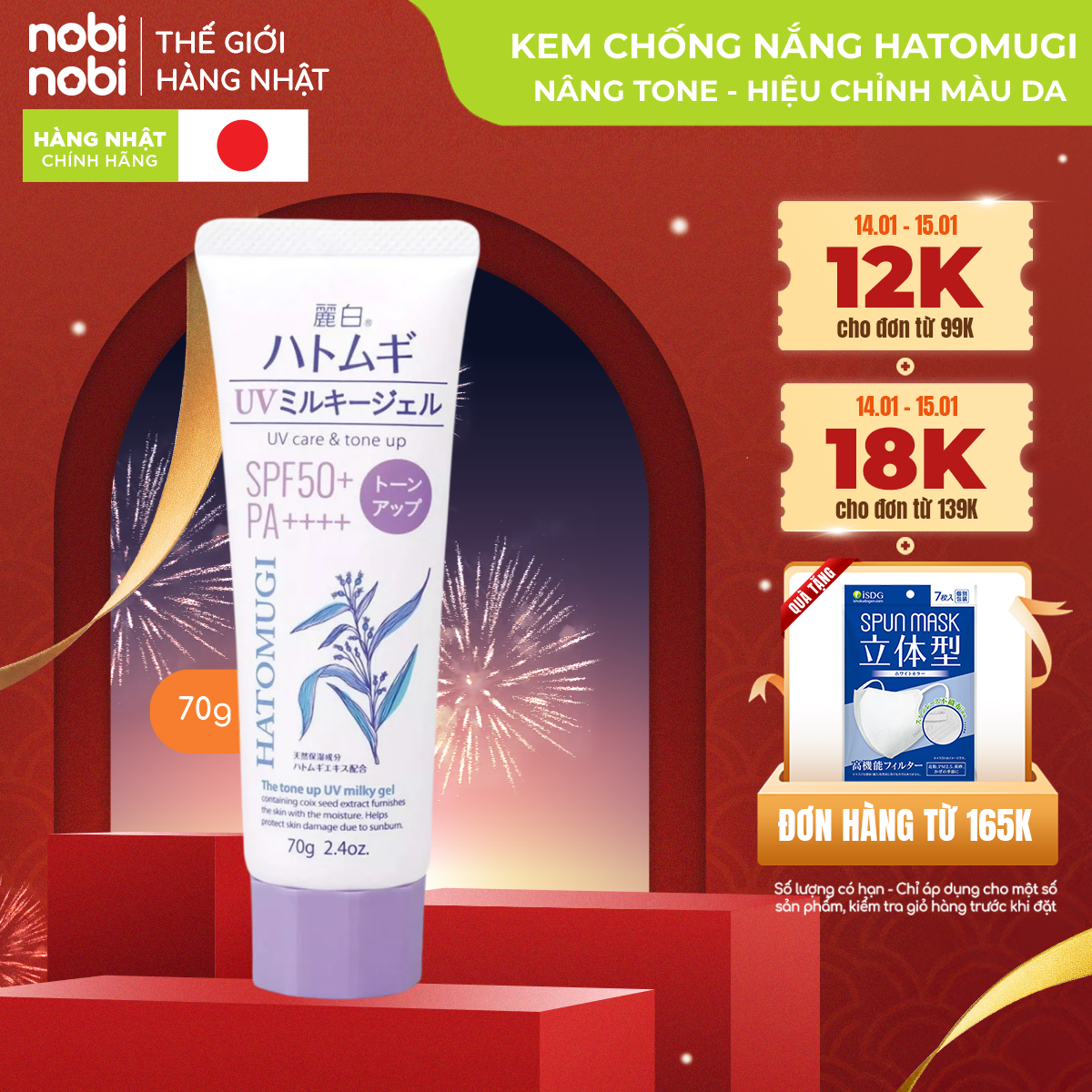 Kem Chống Nắng Reihaku Hatomugi Nâng Tông và Dưỡng Ẩm Cho Da SPF 50+ PA++++ Tím 70g