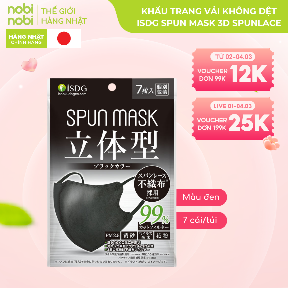 KHẨU TRANG VẢI KHÔNG DỆT DẠNG LẬP THỂ ISDG SPUN MASK 3D SPUNLACE, 7 CÁI/TÚI (MÀU ĐEN)