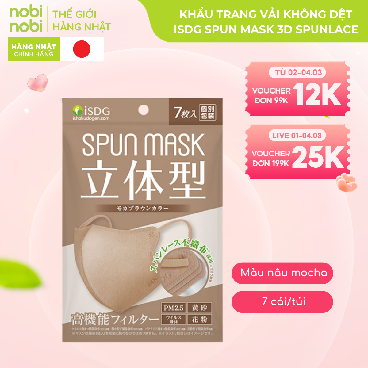 KHẨU TRANG VẢI KHÔNG DỆT DẠNG LẬP THỂ ISDG SPUN MASK 3D SPUNLACE, 7 CÁI/TÚI (MÀU NÂU MOCHA)