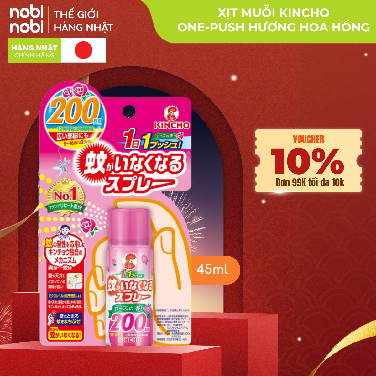 XỊT MUỖI KINCHO ONEPUSH HƯƠNG HOA HỒNG 45ML
