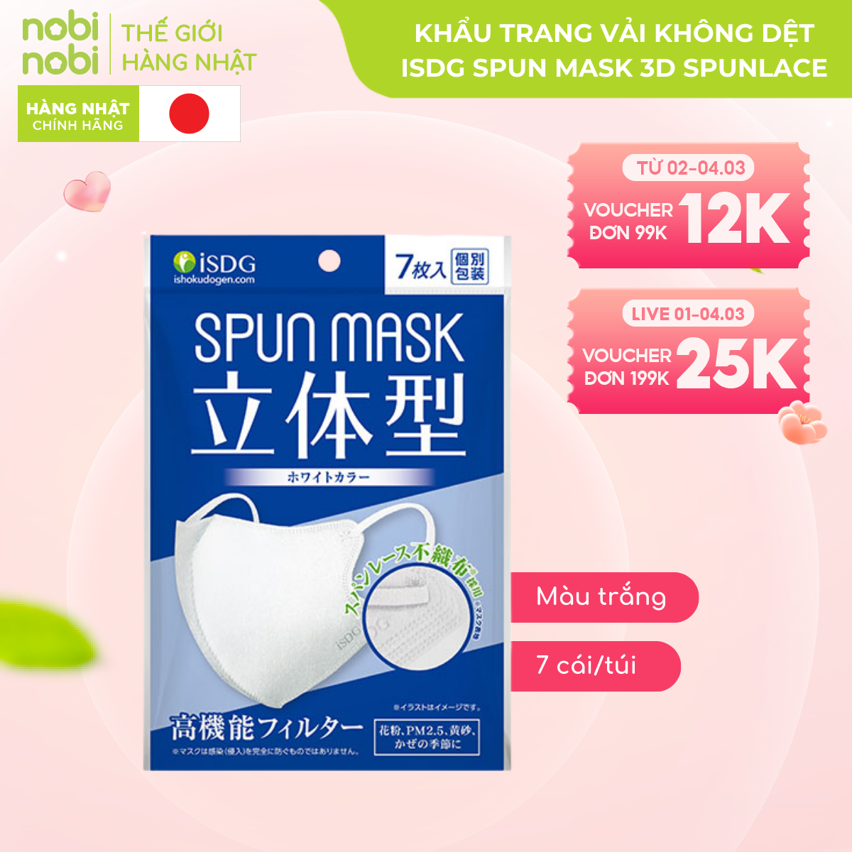 KHẨU TRANG VẢI KHÔNG DỆT DẠNG LẬP THỂ ISDG SPUN MASK 3D SPUNLACE, 7 CÁI/TÚI (MÀU TRẮNG)