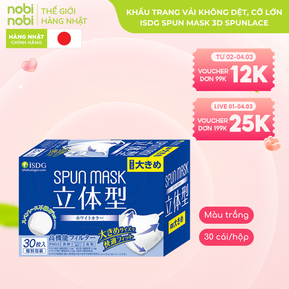 KHẨU TRANG VẢI KHÔNG DỆT DẠNG LẬP THỂ ISDG SPUN MASK 3D SPUNLACE, 30 CÁI/HỘP (MÀU TRẮNG)