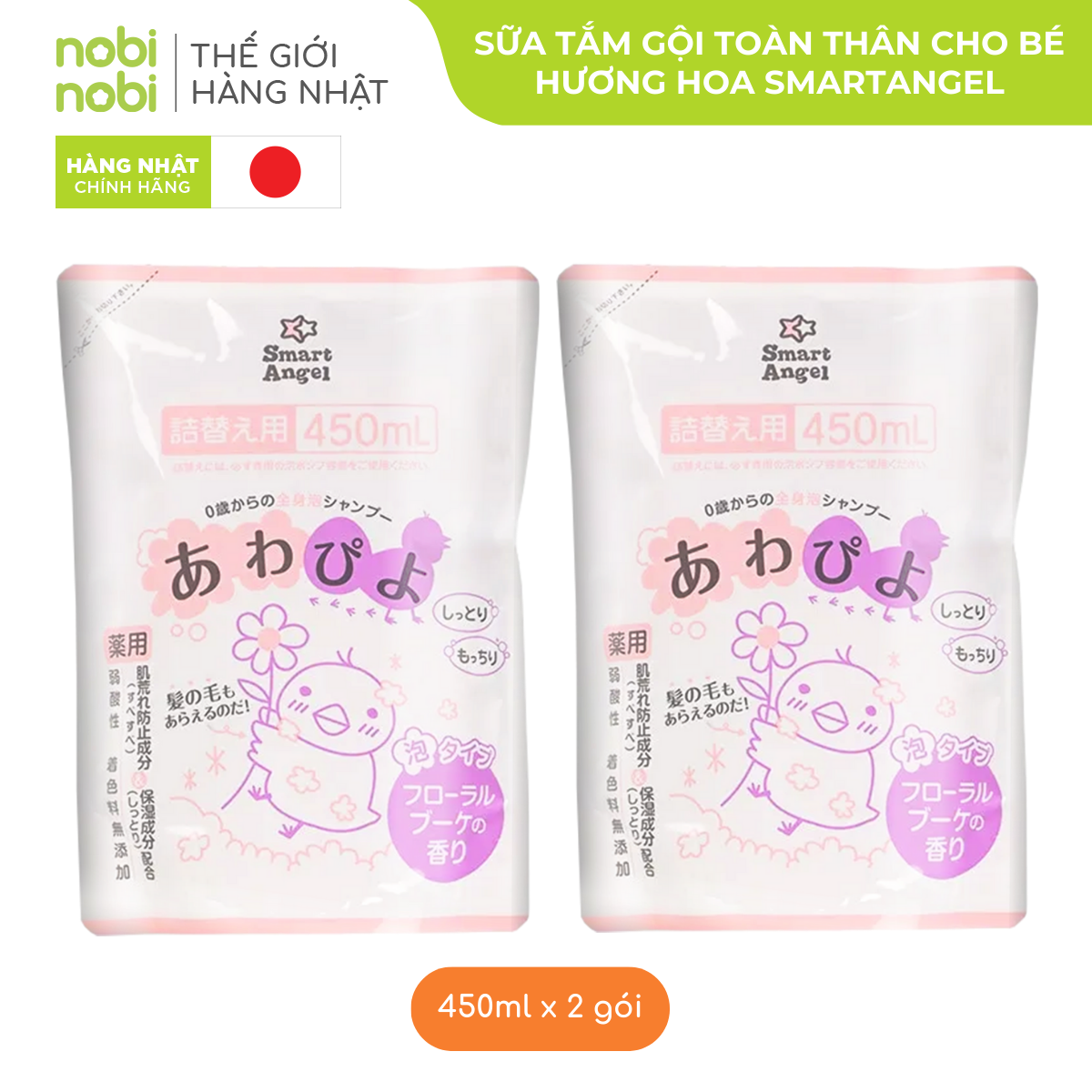 Sữa Tắm Gội Toàn Thân Cho Bé Awapiyo SmartAngel Dịu Nhẹ Lành Tính Hương Hoa 450ml x 2 gói