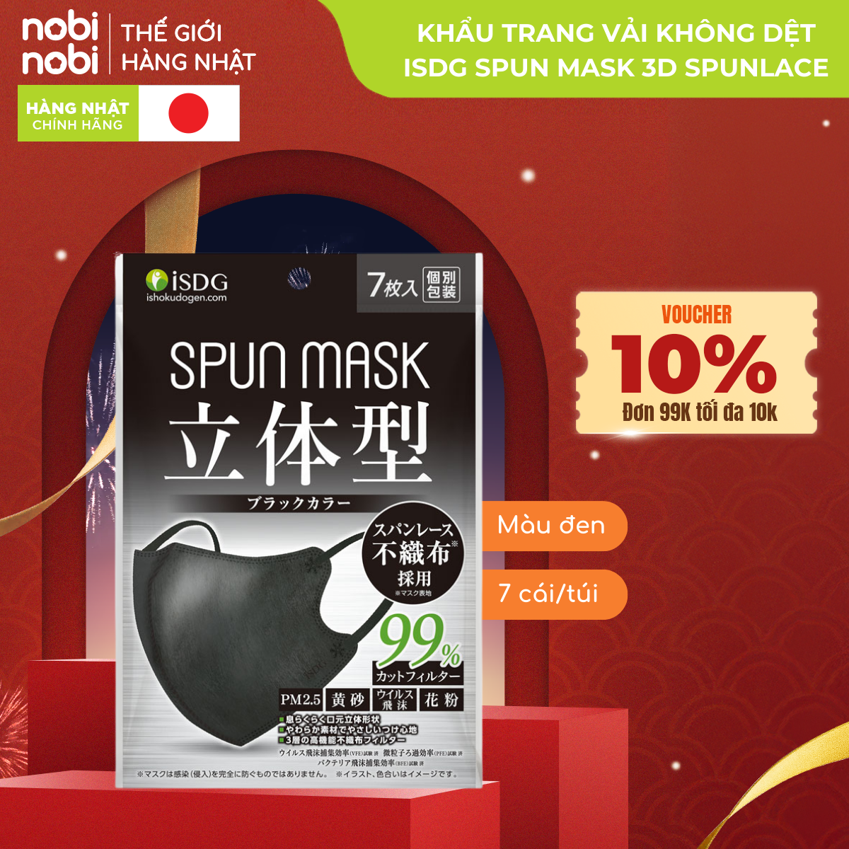 Khẩu trang iSDG SPUN MASK 3D Spunlace Chống bụi mịn PM 2.5, 7 cái/túi (Màu đen)