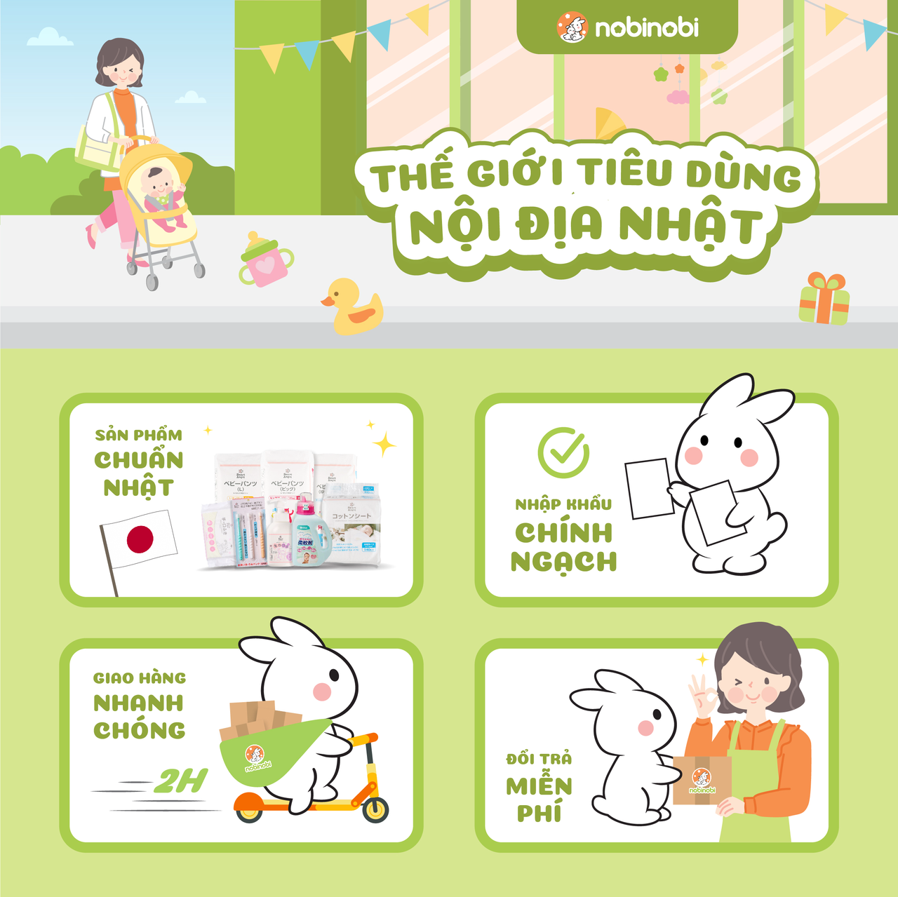 Ra đời từ giữa năm 2023, nobinobi thuộc công ty TNHH TMDV Farmi chính thức gia nhập lĩnh vực phân phối và bán hàng tiêu dùng nội địa Nhật. Bằng việc nhập khẩu những sản phẩm với chất lượng an toàn hàng đầu Nhật Bản, nobinobi mong muốn đáp ứng đa dạng tất cả nhu cầu thiết yếu trong đời sống của gia đình Việt. Đồng thời mang đến những trải nghiệm an lành và tràn đầy yêu thương.